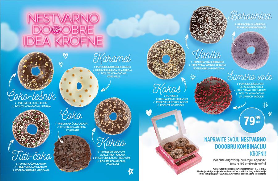 * Ukoliko je u kutiji manje od navedene količine krofni ili su drugi artikli u kutiji, kutija se naplaćuje 50 RSD. Cena 79.99/ kom se odnosi na cenu jedne krofne.