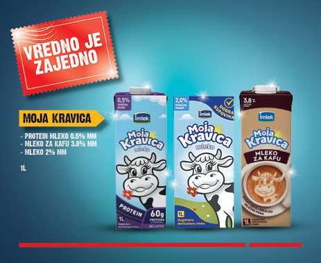 Moja Kravica mleko pretvara svaki zalogaj vašeg obroka u pravo uživanje, dok Moja Kravica mleko za kafu daje puniji ukus i kremastu teksturu svakoj šoljici kafe. Sa 3,8% mlečne masti, savršeno se uklapa u kafu, pružajući bogatstvo ukusa i kremastu teksturu.Probajte i novo Moja Kravica protein mleko bogato proteinima koji pružaju energiju tokom celog dana. Sa 60g proteina po litru, 0,5% mlečne masti i bez laktoze, idealno je za celu porodicu.